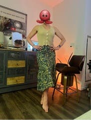 This skirt has much potential and can be styled dressy or casual. There was a dip in the waistline where the fabric is heavier which you can see in the photo. Otherwise, this is a fun TTS piece.