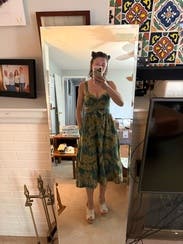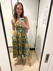 Loooved this dress! It was the right amount of revealing for me, with cute cutouts on the side and a bodice that allowed me to skip a bra. The material is a thicker linen, so it was nice for transitional weather. Could be hot for the height of summer. Tie closure in the back, so I was able to wear a 4 and pull it tight to size, even though I’m normally a 2. Will definitely rent again!