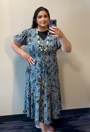 This dress is a no-brainer. I wore it twice -- once with chunky heels and fun earrings, and once with sneakers. Both were a hit and got tons of compliments. It is flowy and comfortable/forgiving, while being very comfortable because of the fitted waist and low v-neck. The print is playful and pretty, and the overall style is versatile for almost any occasion. And Ulla is always fabulous quality and stand-out prints, this being no exception.