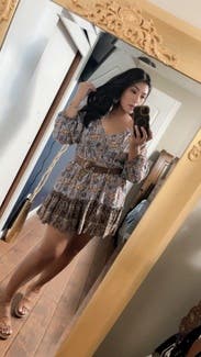 I love the pattern on this dress! The elastic on the waist makes for a super comfortable fit and the tie on the front is functional if you don't want such a deep v. Perfect with a pair of sandals or could easily be dressed up with a heel! The style is lightweight and is not lined but not see-through. I recommend taking your usual size here or size up if you want a bit more length!
