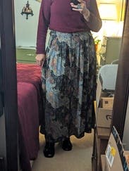 The paisley print and colors are absolutely gorgeous. The skirt is a button front with pockets and hook closure. It is VERY light weight and pretty long. It’s a nice weight for winter in the South. Probably could be worn year round. The waist was just a little tight on me, but i don’t have much of a waist. Spanx made it perfect.