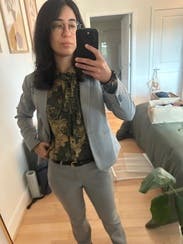 After wearing this Ulla Johnson is my new favorite luxury workwear designer, I was amazing by how soft and comfortable the fabric of this shirt was. I was a little skeptical of the green and yellow/golden colored pattern when ordering but it was honestly so beautiful. I got lots of compliments and just really felt so put together. The shirt is by far the softest/more comfortable dress shirt I have ever worn by far. I didn’t get a ton of pictures of the whole outfit but I wore this with black trousers and flats with my brown bag to break it up. The statement of the outfit was definitely this shirt, I would love to purchase this for myself sometime in the future but for now loved renting this and am excited to rent more pieces from Ulla Johnson like this one.