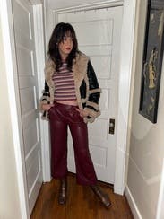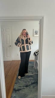 This coat is incredibly chic. It’s very well-made and high-end, and the fur is luxe and super soft. However, I don’t think it worked with my body shape. It felt bulky and the fur overwhelmed my frame, especially the fur at the ends of the sleeves (I’m 5’0”). I jokingly named it “Muppets Take Manhattan” because it’s super cool but made me look like, well, a Muppet. It did seem pretty TTS; the shoulders and arms fit perfectly and I was able to close it with no problems. That said, I couldn’t lift up my arms because it was stiff. All of that said, I would consider renting a smaller size and just leaving it open; it’s too cool to not try it again.
