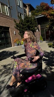 Loved wearing this brilliantly and fabulously colored, graphic, and most unbelievably comfortable and chic tailored and fitted dress-the most perfect for day-night! Loved the stretch of the fabric, long sleeves, and flattering neck line-made the gorgeous graphic and its colors pop even more! Found TTS, petite friendly, and beautiful photographed sitting in my wheelchair to plan the Connective Strength Fashion Show at coffee. ☕️ Couldn’t find a more perfect chic dress to advertise our fashion show while looking professional and ready to make an unforgettable night celebrating Disabled Glamour & fundraising! 💚🫶🏼🦓 A MUST-Rent United in Motion dress! So easy to layer with tights, boots, cardigan, jackets for fall and winter looks!