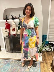 Fit my body perfectly. Appreciated the ruching on the belly. Looks a little weird at first but overall not a problem and made the dress much more comfortable to sit and stand in. Beautiful colors like a watercolor and received many compliments.