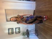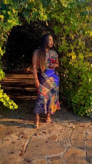 One of my favorites. The fabric is silky and feels so good. The print is chic and lively. So many compliments! The open back is stunning. Wore some boob tape and walah!