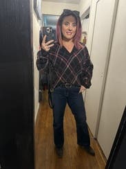 Great pick! Loved the colors and the v neck for a curvier woman like myself. Warm enough to wear on its own on a 60 degree afternoon.