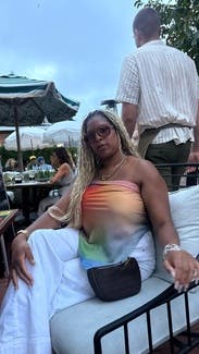 Looked fab paired w white linen pants. Just so happened to have a bag that was a match made in heaven. Did not run into any issues with it staying up as other users mentioned, but I am pretty flat chested. Would highly recommend and hope to rent again!