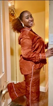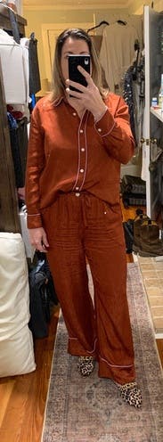 A perfect shirt with the matching pants for a dressed up lounge day. The material was silky soft but thick for an early spring day with a slight chill.