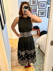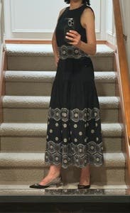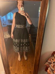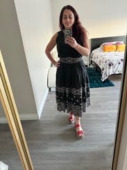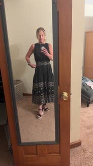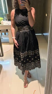 This dress fit perfectly. It had beautiful embroidery detail. The only downside is that when I sat down the belt detail folded over. The back is open so I wore a tank top underneath to avoid showing my bra. I wore this dress a couple of times because it fit so well.