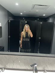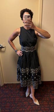 I don’t understand why designers make dresses like this open back. There’s no need for it. I had to wear a black tank underneath. The top is a bit bulky and big and the waist is very true to size with zero stretch. It was a fine wear, and a pretty overall dress, just not my most favorite RTR rental.