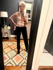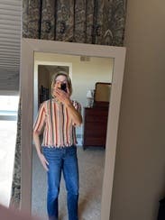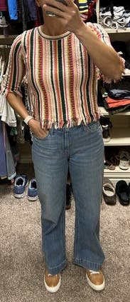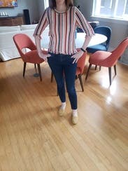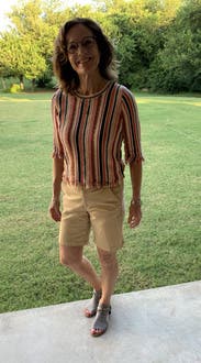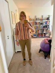 I enjoyed wearing this fun top. It’s not clown-like as many vertically striped tops are. It goes well with many bottoms for different styling options.