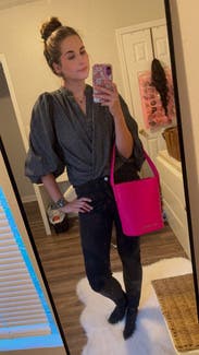 Loved this top. So chic and sophisticated. I wore it once tucked into a leather skirt and another time untucked with jeans. Worked both ways. The material is on the heavier side but not overly warm. Perfect for fall.