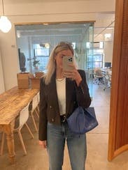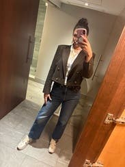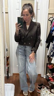 Wore this to work with barrel jeans and heels. Great transition piece to wear to dinner later. It’s the perfect crop, and the thickness is better for colder weather, I can imagine this getting hot in the summer since it’s fully lined.