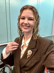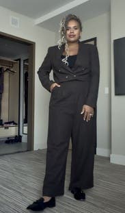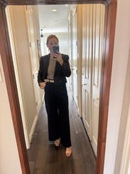 I wore this cropped suit jacket with the matching pants but also with a work dress, and liked it more with the dress than the pants. The cut is fun/different but the color (which has some tan and black stripe detailing with the brown) and weight of the fabric definitely make it more winter wear.