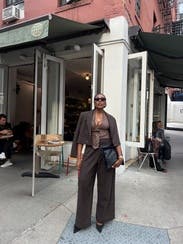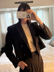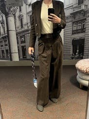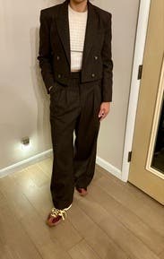 Fell in love with this beautiful brown pinstripe, loved the cropped fit and tailoring felt so gorgeous wearing it, and received endless compliments! Found TTS, although oversized in design and style. Obsessed and SO want to buy! A professional MUST wear!