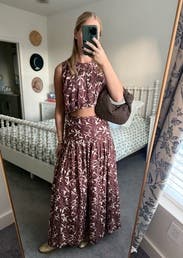 I am OBSESSED with this set and got so many compliments all day. Comfortable and airy. Wore on a hot day and the skirt was a little warm but has two slits to help air movement. **Does show sweat so be warned** Color is a true maroon!