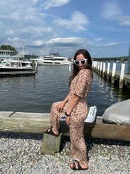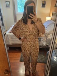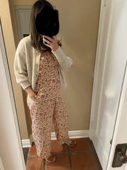 This jumpsuit is very cute and would have been cuter if I had sized down. I was in between sizes and sized up because the xs was out of stock. It was too big but looked cute belted so can’t complain too much. It was also the perfect length for me.