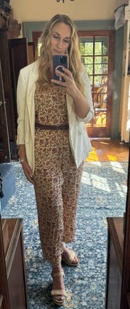 This silk jumpsuit was so comfortable! I wore it to work. It fit well (looser on top, but not sagging or falling off) and was surprisingly flattering on the waist.