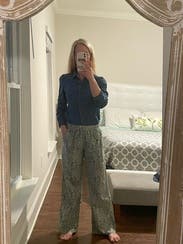 Love these pants and the print is so cute. Can dress them up or down. Wish they were a little higher waisted and longer, but that is generally my usual problem with length.