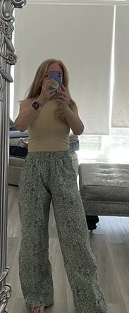 I ended up wearing this outfit several times because it was so flattering, perfect light set for summer, and I received so many compliments on it - I really wish I purchased it! Its a linen material so its light and the pattern hides any wrinkles it may have. My waist has an elastic band so it's easy to wear. I found it to be slightly small in the crotch but I have a high waist and am used to wearing high waisted pants so it could be that I just kept trying to pull them up. Overall I loved them!