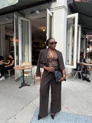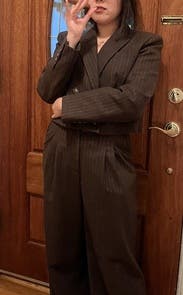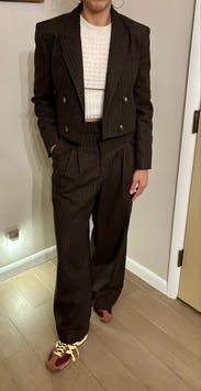 Loved the subtle pinstripe and brown coloring, fits beautifully even with the oversized style-the fitted waist and cropped suit jacket make the perfect combination both standing and sitting although it was 1 inch or more too long, but heels made for a perfect fit! Obsessed with the suit set and cannot recommend renting enough; looked gorgeous for headshots and my Overlake Alumni event and received endless compliments standing out in the crowd! A Must-Rent for any Professional Event! Rent the suit set if possible!
