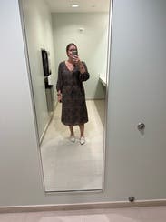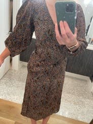 I had boho chic visions of this dress but on, it just felt matronly and frumpy. The waist/hips are tight and it's knee length, but the sleeves are large and the bust is loose. Pattern was darker in real life. I wore this to a shower with heeled boots and zero comments on it, which is how I know when a rental was a bust! Wouldn't wear this one again.