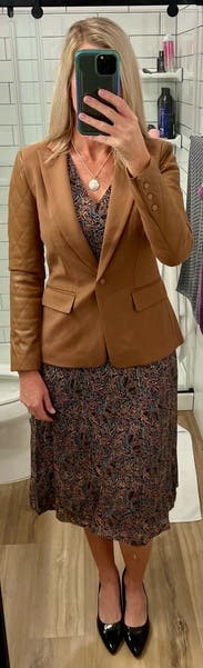 The colors & pattern of this dress felt a little old lady to me. And the ties are on the side so it looks weird if you tie it in the front or the back. I decided to wrap the tie around my waist before tying it. Wore this with a suede moto jacket & booties, felt cute with the jacket on.