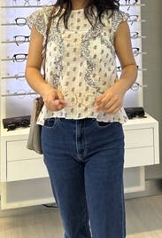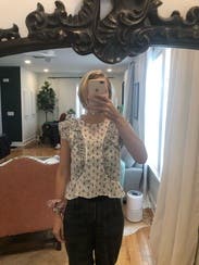 Super cute top that fits TTS except for the fact that it barely grazed the top of my high-waisted jeans. I am 5'8 and sized up to an 8 to hopefully add some length since top looked shortish ok model. Nope, back it goes.
