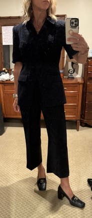This suit is truly stunning- and like most VB - it’s all about the jacket. It’s hard to find a short sleeved jacket that makes sense but this one is classic and comfortable. I love the fabric- I think it is a black and navy floral brocade. The colour is so dark it’s hard to tell. There is a split hem which is so flattering for curvy figures and short torsos. You will need to wear high waisted pants with it for that reason. I am a 32/26/36 and the 2 jacket was perfect. No notes!