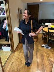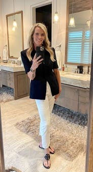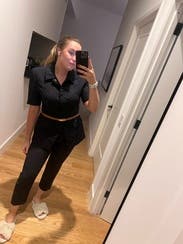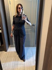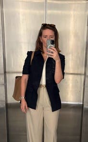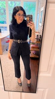 I work from home, and I loved this top for Zoom calls. When I’m not in a meeting, I often wear leggings and a sports bra. This was handy to just throw on over my sports bra when I needed to hop on a Zoom. I sized up a couple sizes because I was worried about the buttons gaping with my large bust, but I think I probably overdid it and could have gone with my normal size or just one size up. That said, nobody could tell it was too big on Zoom anyway. I also wore it to a birthday party for one of my kids’ friends, and I was able to make it work for an elevated play date outfit. If I ever have to go into the office and be seen in person, I might consider renting this again and getting the matching pants too.
