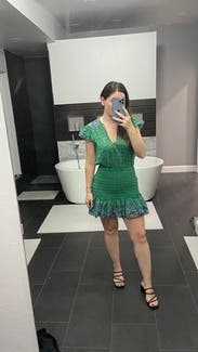 Great dress for roaming a new city on vacay.Nice deep green and fun shirring with ruffled hem.Comfortable.