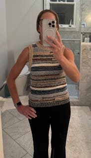 This Veronica Beard is of course timeless. I wore it with a tan cashmere sweater over my shoulders, jeans & tan suede loafers. RTR also carries the matching cardigan, but mix and match works just as well. You could absolutely dress this up with trousers or a skirt instead of jeans. The arm holes were a bit generous in the XL so I wore a tank under it, but it barely showed under the arms only. I'm tall & was comfortable with the length as well (not cropped)