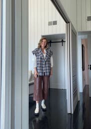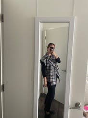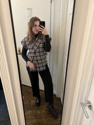 Really unique piece: a double-breasted blazer-style vest. I liked it best with a long sleeve T underneath but also work with a crew neck sweater under it. Fabric is nice quality and colors are great for fall! I usually do a M in blazers, and this is oversized, so the S fit me nicely (37 in bust 30 in waist).