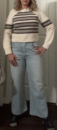 Wore this multiple times on vacation in Iceland. Super pretty details in the sleeves. Very warm. Even with my giant chest, the cropped fit worked ok with high-waisted pants. Would rent again.