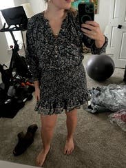 This dress is cute and pretty forgiving even for rounder frames! I don't love my mid-section, so I didn't end up wearing it, but I think that is more of a personal preference. Someone more confident than I could rock this dress. It's a lightweight cotton, seasonless print, and decent length. The top fit well, and the bottom was fitted bc it's a scrunchie situation. Overall the dress looks like it does on the model, just a matter of whether you like that silhouette or not.
