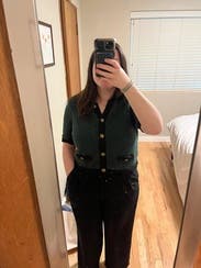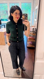 I loved this sweater so much and hated to part with it. It was extremely classic and elegant with the fit.The quality is so high quality and i loved the dark green color and the gold button accents. It was perfect for a client meeting and family event. The sweater is a bit cropped and I wore some high waisted black bootcut jeans with it