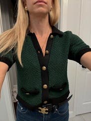 This was a great transitional piece. It’s still 80+ degrees in October here, and I wanted to start feeling fall even though it didn’t feel like fall! This did the trick. It is a lightweight boucle knit in dark green with black trim and antiqued bronze buttons. The fabric is thick but breathable. The short sleeves, and high/low hemline make it slim and comfortable for warmer temps, while still being warm in cooler temps. I knocked off a star because it was cute but just not a knockout for me. It was a little fussy to style because of the hem - you couldn’t tuck it in, and you need to wear high waisted bottoms to make it work. I tried several skirts but none really worked with it. I have a very short torso, so this wasn’t cropped on me, but it probably would be for a taller person.