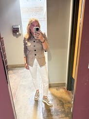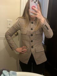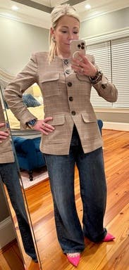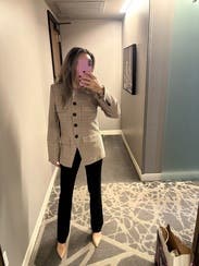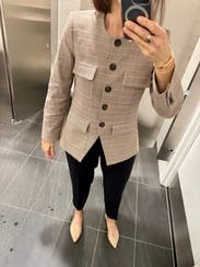 Loved the trendy spin on a classic looking blazer. The cut of the front was very flattering with high-waisted slacks. The blazer looks great buttoned all the way up, but looked nice unbuttoned as well. Versatile piece that can be worn for work or dressed down with jeans for a more casual look. Fit is TTS.