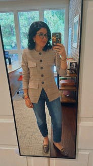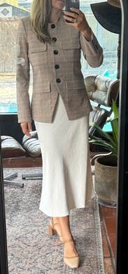 Loved this blazer. It is stretchy and breathable but reads fall ready. It is easy to simply button up and go. Surprisingly versatile. Loved it with jeans and brown trousers. Very flattering, easy to style, and interesting. I loved the split hemline - it looks great for curvy figures/short torsos. Will absolutely rent again.
