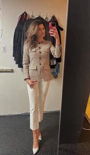 This jacket is everything. I wish I could buy it but others should have a chance to love it first! I wore it twice and got so many compliments both times, once completely buttoned up and the other open with a sleeveless sweater.