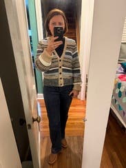 Surprisingly easy to coordinate. Goes with a lot. Great airplane and office cardigan. It’s heavy and warm, though not very breathable due to the fabric blend. Ideal for cooler weather. The long sleeves are great for us tall folks and can easily be pushed up on the forearm thanks to the unique cuff design. Has some stretch but strongly recommend you taking your usual size—the buttons aren’t super secure.