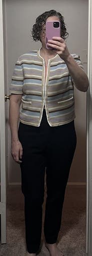 Love at first try! The colors are heavenly. The construction, the shape, the texture, the quality! 5/5 🤩. I wish there was a weeeee-bit 👌🏾 more hold/tightness on the clasps because they do become undone quite easily but certainly not a reason to skip the rental. It is, however, a good reason to make sure you have a cami or shirt under to avoid a fashion accident. Worn to work this go around; I plan to wear it everywhere.