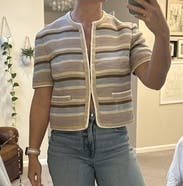 Multicolored stripe (45% Cotton, 38% Polyester, 17% Viscose). Jackets. Short sleeves. Front button closure. Shoulder to hemline length: 20.5". Imported.