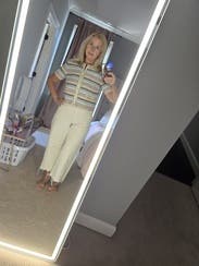 This top is darling! The colors and fit are perfect. Got a lot of compliments on this one and can wear it multiple ways.