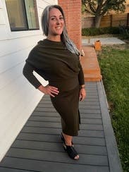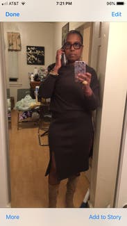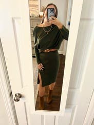 It’s a perfect sweater dress for work or for a date, love it with a belt and dressy boots. The fabric is thicker, so it hides more and holds its shape well. I saw the reviews about fussiness with the neckline, but I think it provides versatility. Off shoulder, or showing more of my back, or more of a boat neck. I made it work. So happy this is now a permanent piece in my closet!