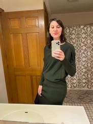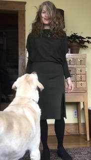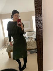 I loved the cut of the stress. Great for zoom calls, incredible color. Very feminine and warm, perfect winter dress. Just a little bit itchy, but true to size.