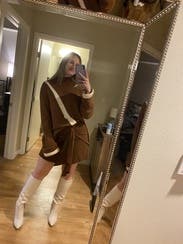 Pretty color, chunky fabric. Didn’t love where the slit hit. You have to wear high waisted pants or it just looks strange