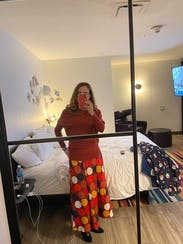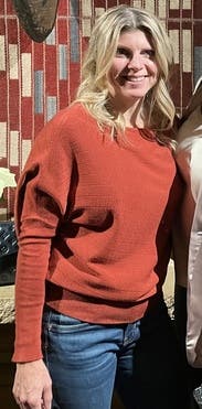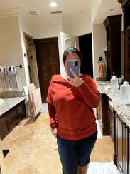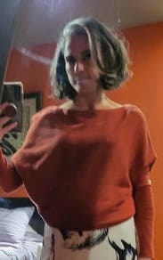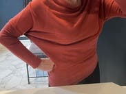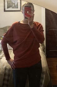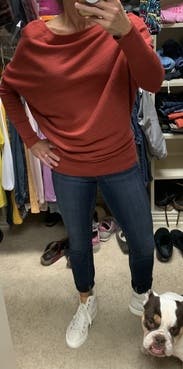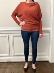 Comfortable fall sweater. Love the rust color--can be dressed up and down with jewelry and choice of pants/skirt. I'll be wearing this multiple times during my rental! Took me some fiddling to figure out which side the asymmetry was meant to drape toward. The answer is to the left. You can tell by the direction the of stripes in the knit pattern--imagine they're "pointing" from the collar to the direction the sweater should slouch/drape.