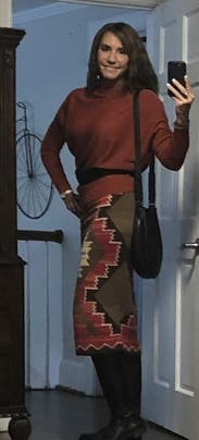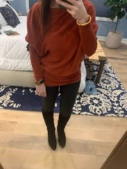 Loved the style of this sweater - the loose fit up top and fitted waist gives the sweater a slouchy, sexy, and elegant look. The rust color is also unique, but looks great - I’ve never worn anything in this color, and am now a fan!